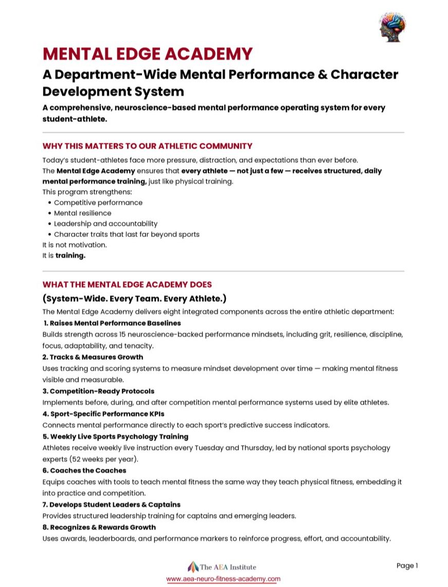 This PDF outlines how the Mental Edge Academy functions as a comprehensive, department-wide mental performance and character development system for student-athletes. It explains why structured mental training matters, what the Academy delivers across every team and athlete, and how mental performance is trained, tracked, and reinforced over time. The document highlights core components such as daily mental fitness, competition-ready protocols, leadership development, coach education, and measurable mindset growth. Use this resource to help Athletic Directors, school leaders, or sponsors understand the full scope, structure, and long-term impact of implementing Mental Edge at the department level.